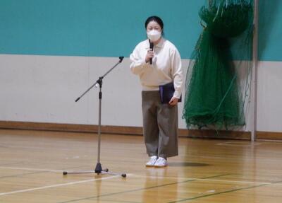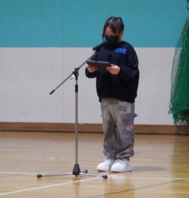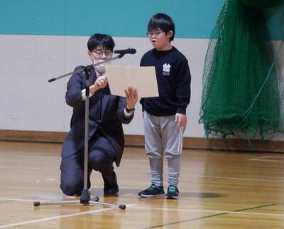 終業式では、児童の『2学期を振り返って』の発表と、児童会代表からの挨拶がありました。