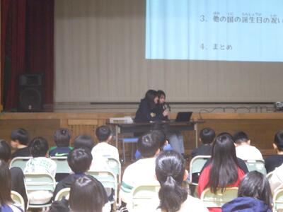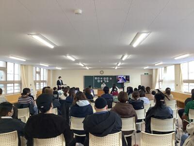 年前から、本校指導部と枝幸警察署の担当の方で連携を取り合い、以下の『ねらい』を達成させるために、年明けから『警察の方の講話』を計画してきました。今日、2年生からスタートです。