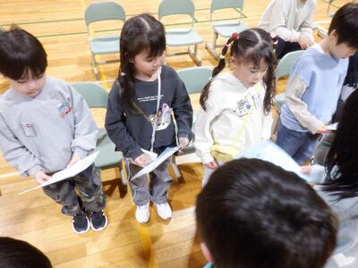 〇6年生による「枝小マーチ」で1年生が入場 〇児童会からの挨拶 〇3~5年生による学年発表 〇2年生からの「校歌手作り歌詞カード」と「持ち物チェックリスト」プレゼント 〇1年生のお礼の言葉 |