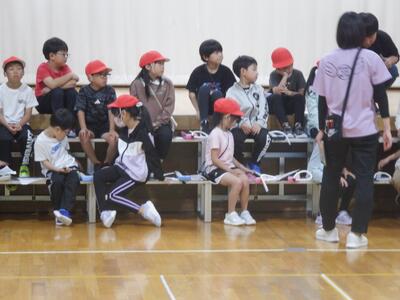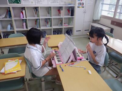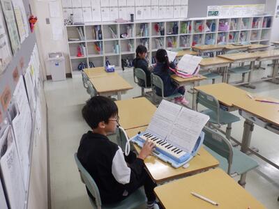 3校時目。2年生は『こぎつね』(鍵盤ハーモニカ)の練習、6年生は『男の勲章』(ダンス)の練習をしていました。