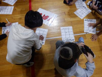 今日の全校集会は、新しい縦割り班の顔合わせを行いました。