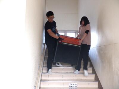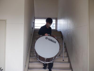 子ども達が下校した放課後には、『会場設営第2弾』として、先生方で2階音楽室から、学習発表会で使用する楽器を体育館まで運びました。階段から降ろすときには慎重に、また、ベテランの先生方は、自分の腰塩梅と相談しながら作業を進めました。