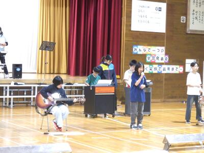 2校時目。5年生が『ケセラセラ』(器楽)の練習。ギターに挑戦している児童もいました。